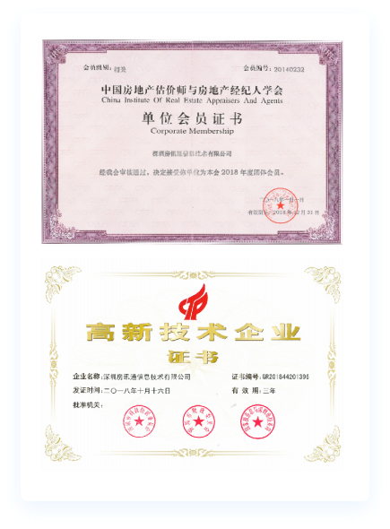 2014年1月,深圳房讯通信息技术有限公司成为中房学会员。2015 年,深圳房讯通信息技术有限公司被认定为国家高新企业和深圳市高新企业。2016年6月,公司组织并成立了全联房地产商会不动产评估专业委员会促进会员实现共同利益为宗旨。截止2018年12月,公司一共获得 20多项著作权证书。